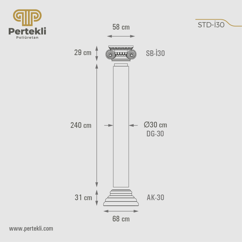 Poliüretan yivli sütun, klasik mimarinin estetik anlayışını modern malzeme teknolojisiyle buluşturan dekoratif bir yapı elemanıdır. Kökeni, Antik Yunan ve Roma mimarisinde sıkça rastlanan yivli (kanallı) sütun formlarına dayanır. Günümüzde ise hem iç hem de dış mekân dekorasyonunda şıklık ve zarafet katmak amacıyla tercih edilmektedir. Yüksek yoğunluklu poliüretan hammaddeden üretilen bu sütunlar, hafif olmalarına rağmen son derece dayanıklıdır. Gövdesindeki dikey kanallar (yivler), tasarıma klasik ve estetik bir görünüm kazandırır. Beton ya da mermer sütunlara kıyasla çok daha hafif olması, taşıma ve montaj sürecini oldukça kolaylaştırır. Neme, darbelere ve çeşitli hava koşullarına karşı dirençli yapısı sayesinde çatlama ve deformasyon yapmaz. Yapıştırma ya da mekanik sabitleme yöntemleriyle hızlı ve pratik şekilde uygulanabilir. Ayrıca akrilik ve su bazlı boyalarla istenilen renge boyanarak mekânın dekorasyonuna uyum sağlayacak şekilde kişiselleştirilebilir.