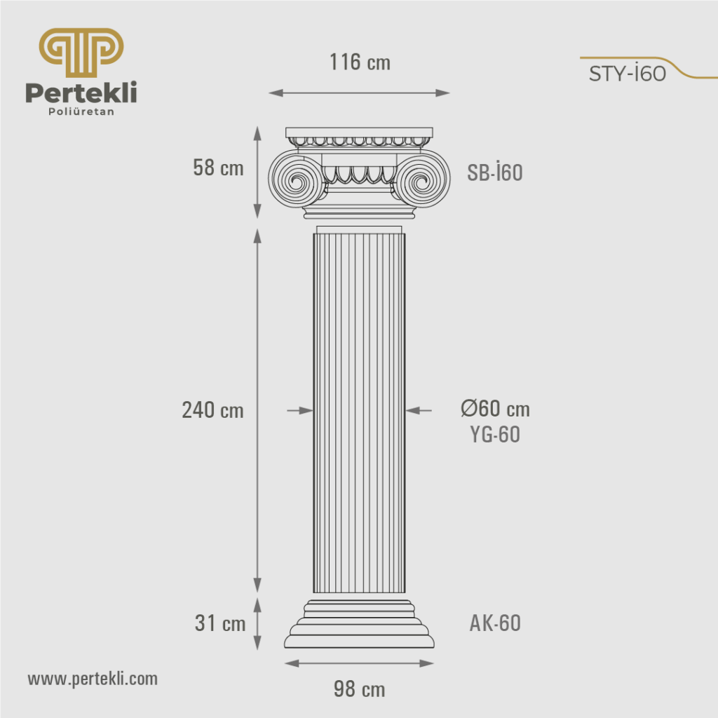 Poliüretan yivli sütun, klasik mimarinin estetik anlayışını modern malzeme teknolojisiyle buluşturan dekoratif bir yapı elemanıdır. Kökeni, Antik Yunan ve Roma mimarisinde sıkça rastlanan yivli (kanallı) sütun formlarına dayanır. Günümüzde ise hem iç hem de dış mekân dekorasyonunda şıklık ve zarafet katmak amacıyla tercih edilmektedir. Yüksek yoğunluklu poliüretan hammaddeden üretilen bu sütunlar, hafif olmalarına rağmen son derece dayanıklıdır. Gövdesindeki dikey kanallar (yivler), tasarıma klasik ve estetik bir görünüm kazandırır. Beton ya da mermer sütunlara kıyasla çok daha hafif olması, taşıma ve montaj sürecini oldukça kolaylaştırır. Neme, darbelere ve çeşitli hava koşullarına karşı dirençli yapısı sayesinde çatlama ve deformasyon yapmaz. Yapıştırma ya da mekanik sabitleme yöntemleriyle hızlı ve pratik şekilde uygulanabilir. Ayrıca akrilik ve su bazlı boyalarla istenilen renge boyanarak mekânın dekorasyonuna uyum sağlayacak şekilde kişiselleştirilebilir.